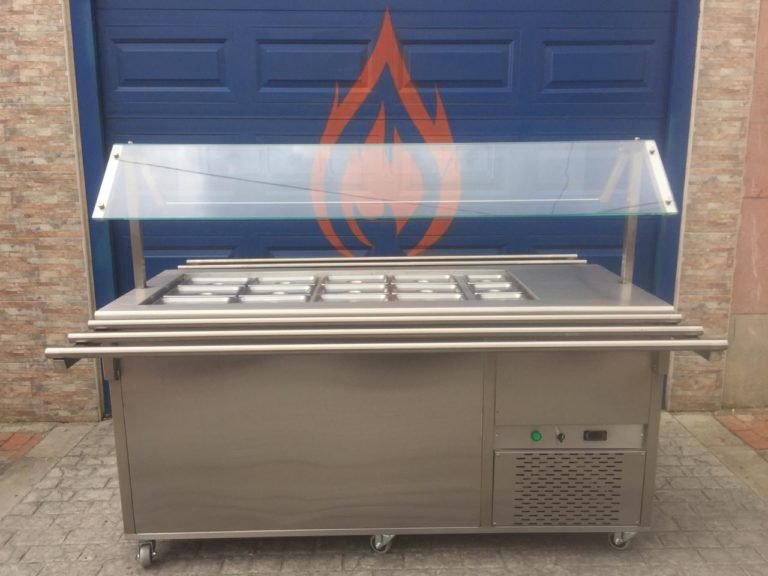 ESTRUCTURA: Elaborada en acero inoxidable, tubo cuadrado de 1 1/2″, base en tubo rectangular de 2″ forrado en acero inoxidable calibre 22 ref. 430, espacio para unidad de 50cms, seis rodachinas tres con freno, desliza bandejas con tubo de acero 1.1/4″ redondo por ambos lados, pedestales en tubos de dos pulgadas para soporte de vidrio de 8mm templado, persianas en lamina de acero micro perforada