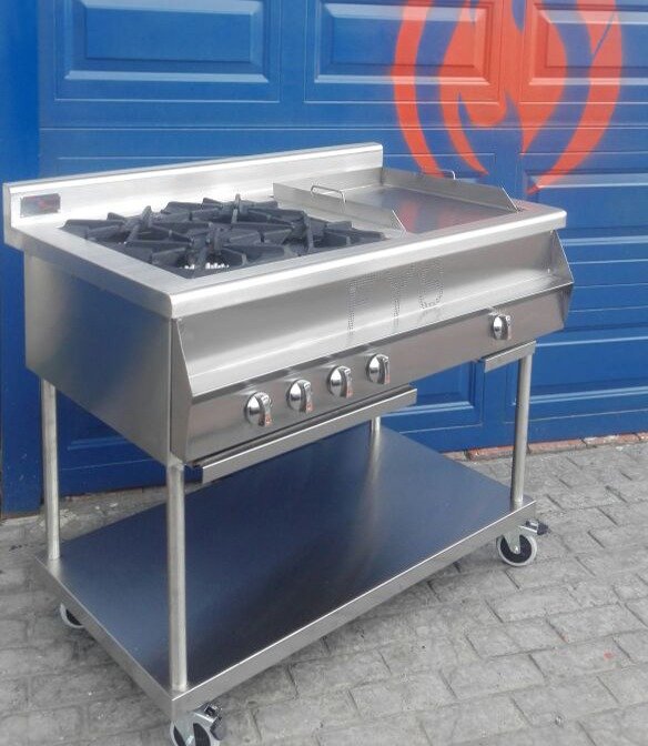 ESTRUCTURA: Elaborada en acero satinado inoxidable 430 calibre 20, medio cuerpo con entrepaño y patas en acero calibre 18 o rodachinas, botones en acero, plancha en acero de ¼, parrilla sobre quemadores en fundición de hierro y quemadores en fundición de aluminio, bandejas recolectoras de grasa