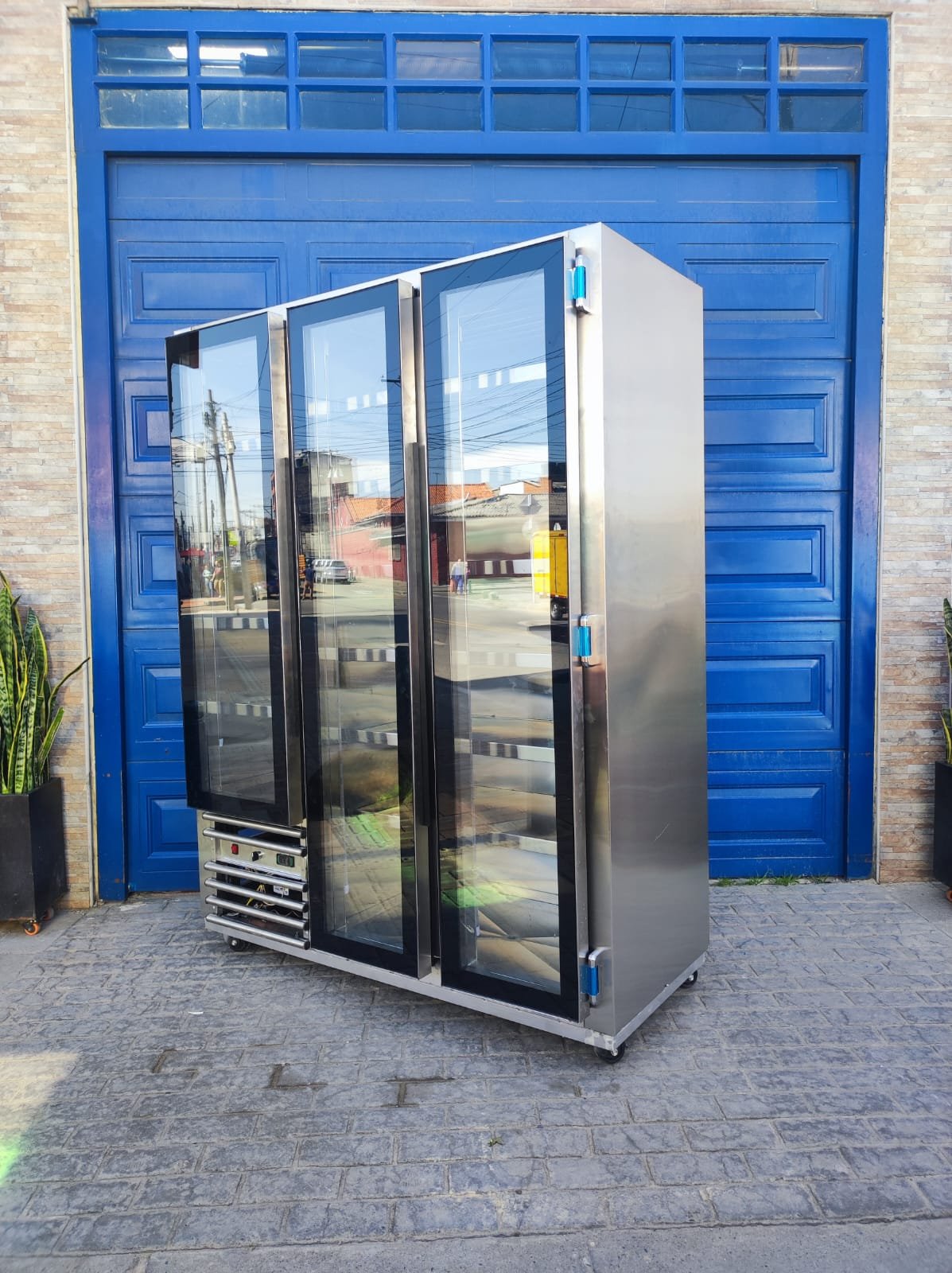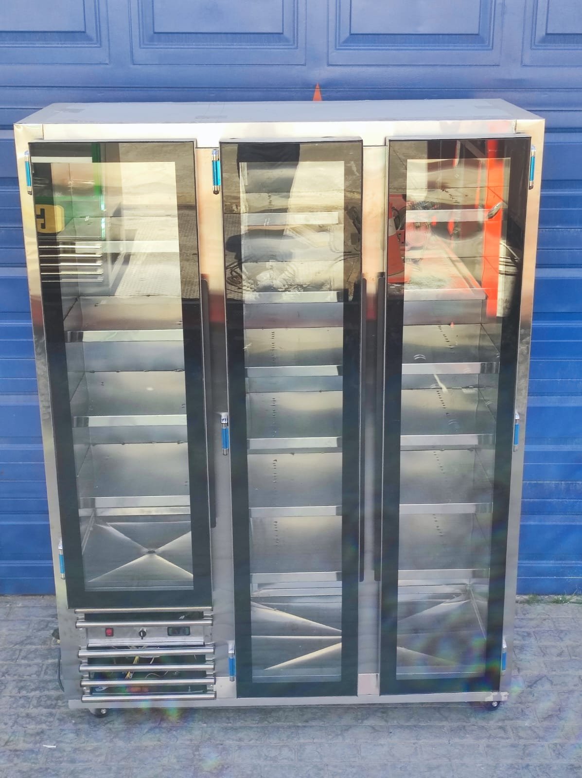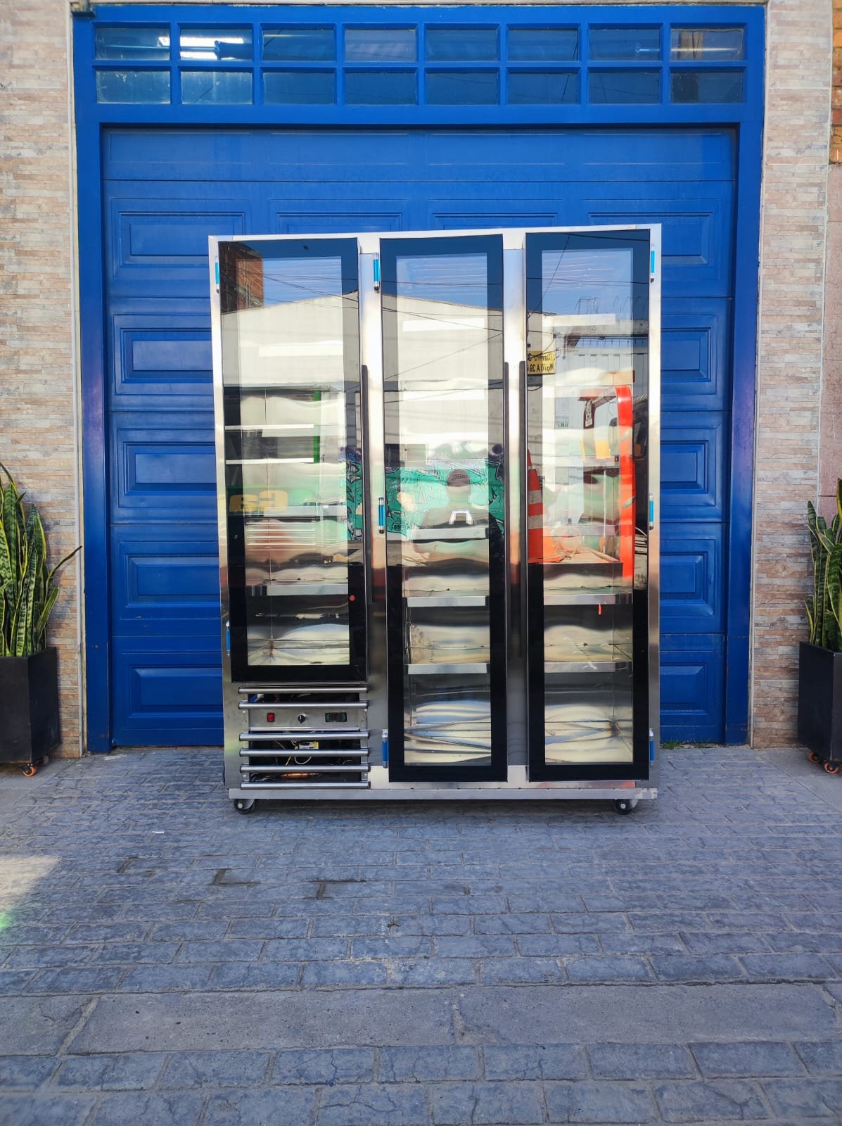 ESTRUCTURA: Elaborada en acero satinado inoxidable 430 calibre 22 y calibre 20, puerta batiente sellada con empaque tipo Whirlpool, empaque de imán, rodachinas de 3” para trabajo pesado, entrepaños troquelados, unidad de enfriamiento incorporada, controlador digital y luz led, aislamiento por medio de poliuretano de 35kg/m de alta densidad, con puertas en vidrio para exhibición.