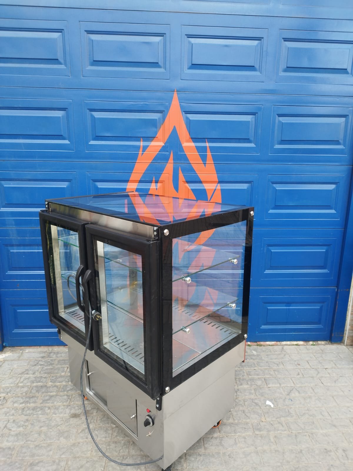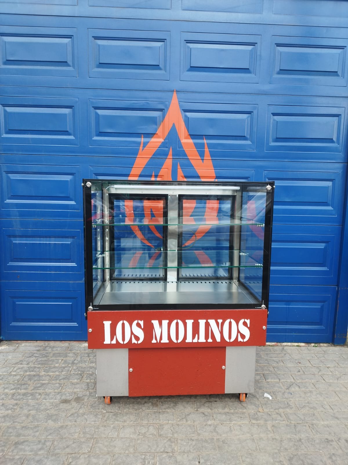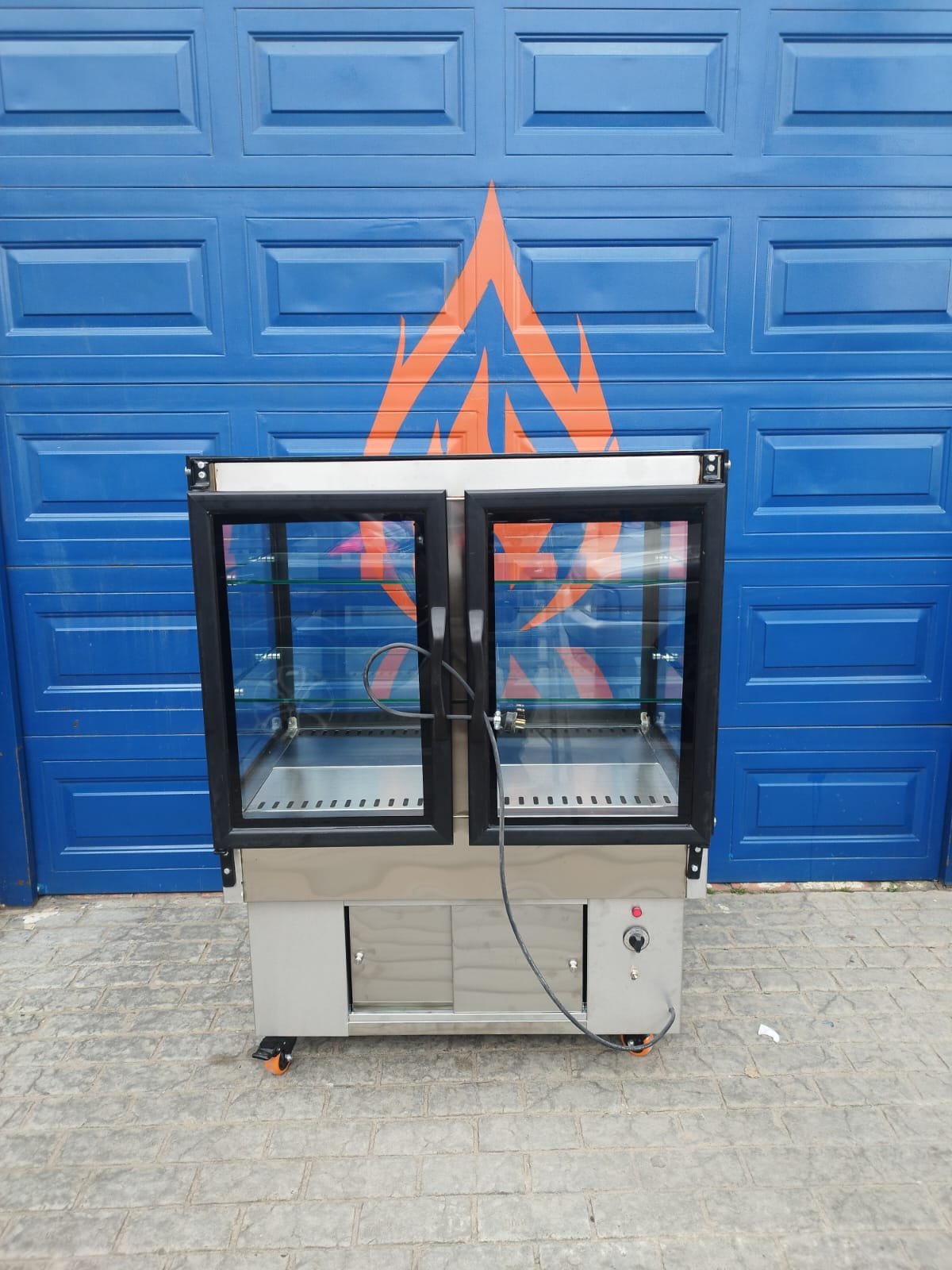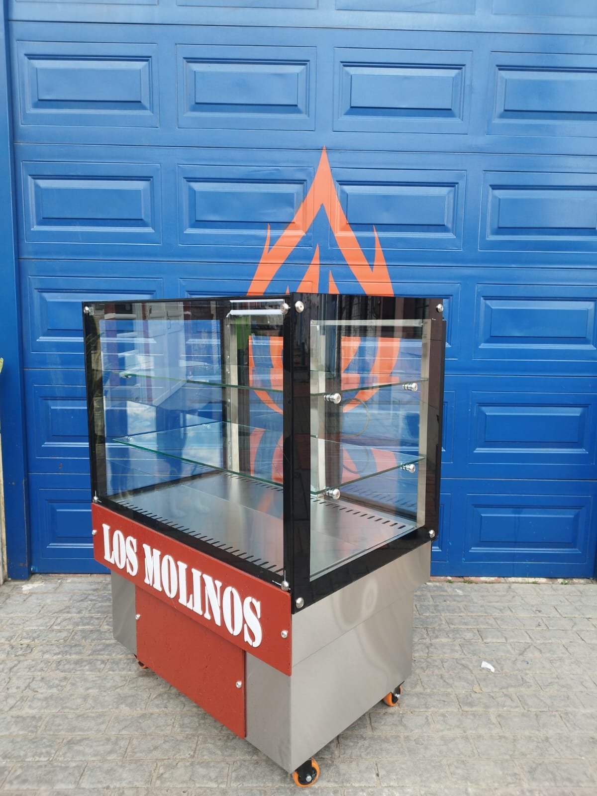 ESTRUCTURA: Elaborada en acero satinado inoxidable 430 calibre 22 y calibre 20, puerta batiente con empaque e imán, marco en acero y doble vidrio crudo, manijas en acero, rodachinas de 3” para trabajo pesado, separador térmico, sistema de recolección de agua en su difusor, Vidrio frontal, laterales y superior de 9mm, pintura lateral, dilatadores, iluminación en led, entrepaños en vidrio, aislamiento Por medio de poliuretano de 35kg/m de alta densidad